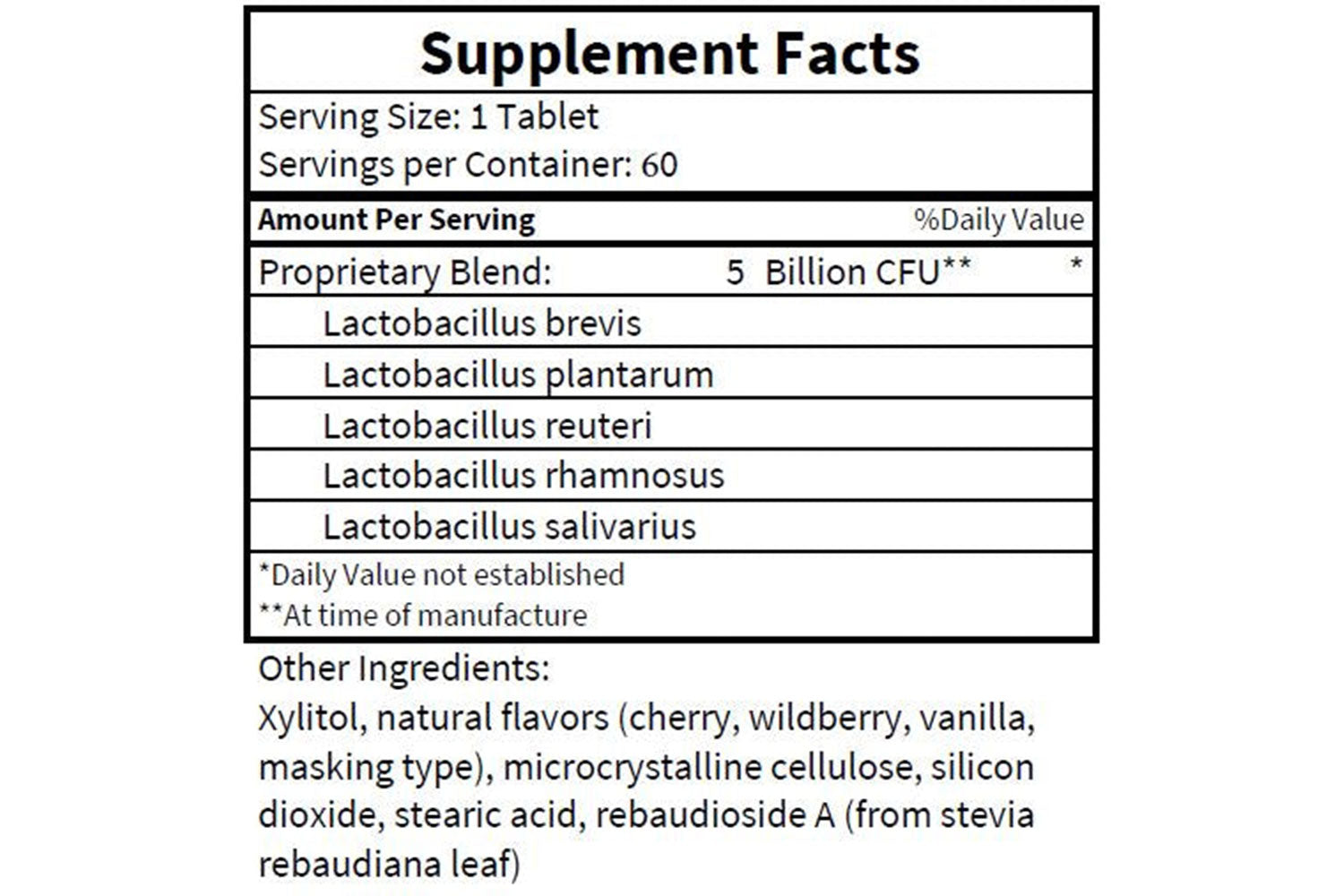Ingredients: Lactobacillus brevis, Lactobacillus plantarum, Lactobacillus reuteri, Lactobacillus rhamnosus, Lactobacillus salivarius, xylitol, natural flavors cherry, wildberry, vanilla masking type, microcrystalline cellulose, silicon dioxide, steric acid, rebaudioside A from stevia rebaudiana leaf