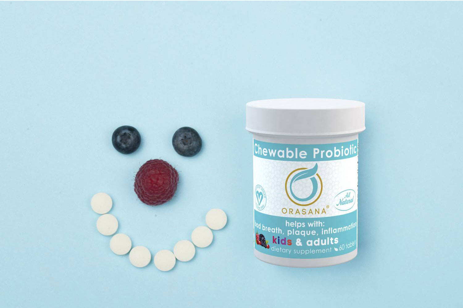 Orasana® Wildberry Chewable Probiotics are a dentist formulated, and all natural vegan-certified probiotic that promote healthy teeth, gums, throat & sinuses, help with cavities, help to reduce bad breath, and contain scientifically studied beneficial bacteria strains to reduce plaque. Our Chewable Probiotics provide a source of beneficial bacteria for the mouth & in the gut. Click here to view press release!